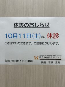 10月11日(土)は、休診とさせていただきます。お薬が切れないようよろしくおねがいします。