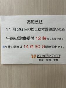 11月26日(火曜日)の午前受付は、保育園健診のため、12時までとさせていただきます。午後の診療は14時30分から行っております。
