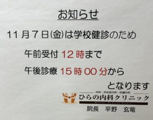 11月7日学校検診のため、午前は12時まで、午後は15時からの診療